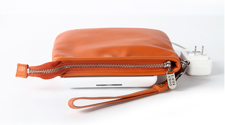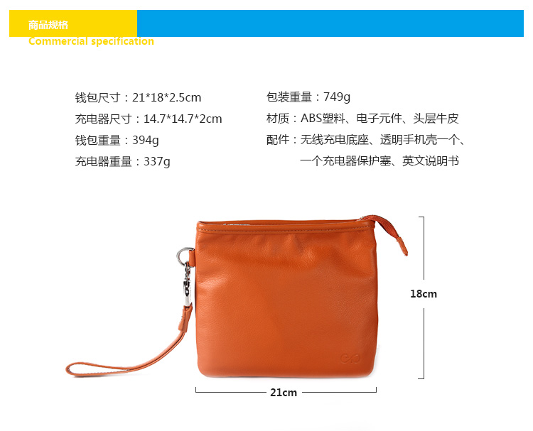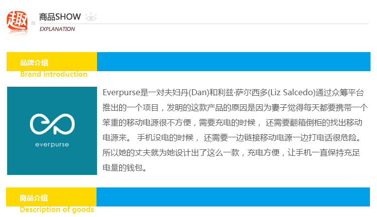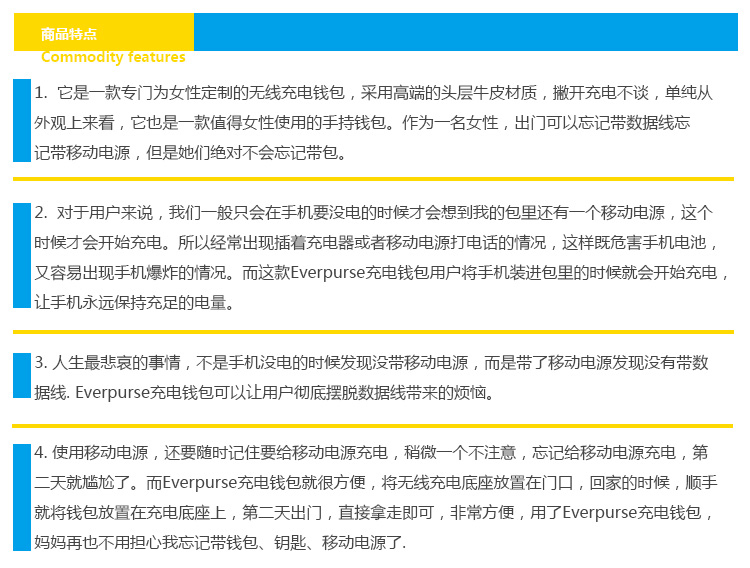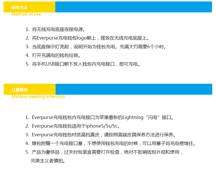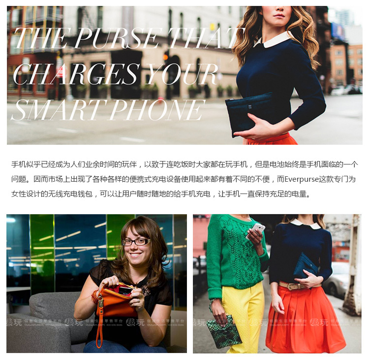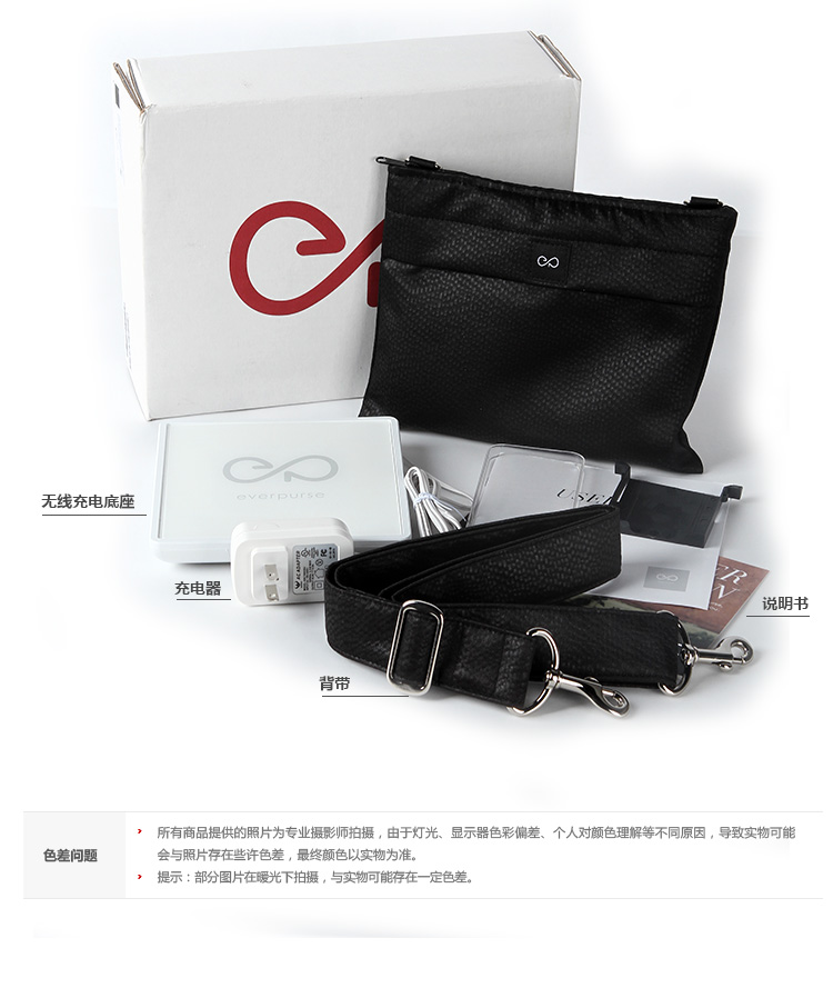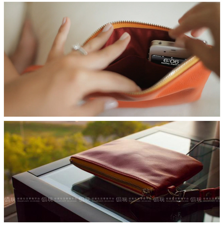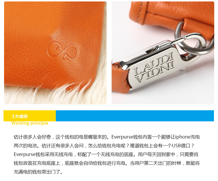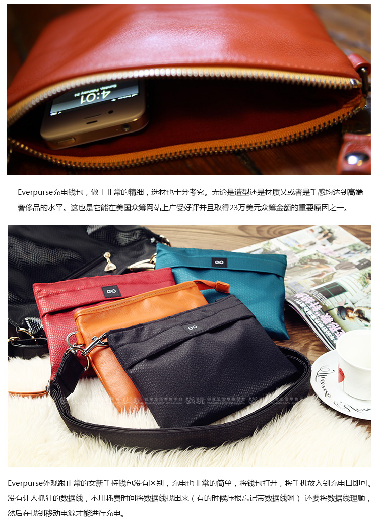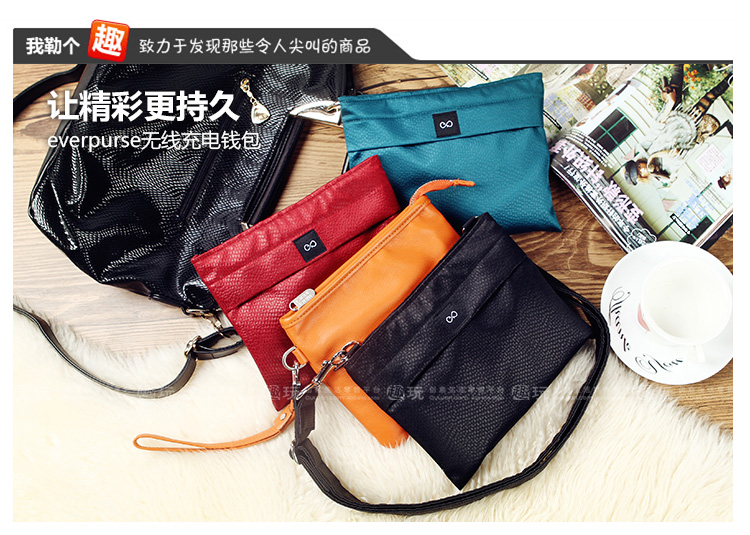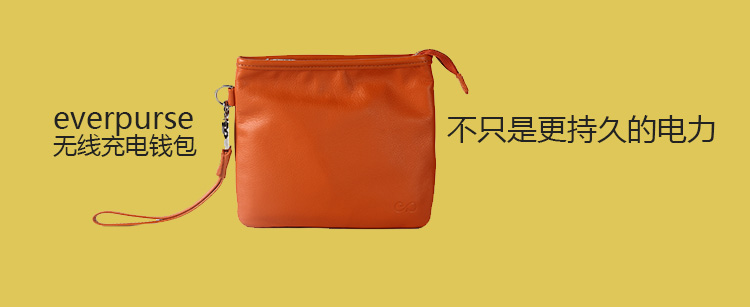 1.使用everpurse充电时非常简单,只需要将手机放到包里,它就开始进行充电,没有各种让你不爽的充电线,可替代成为无线充电包。 2. Everpurse利用的是无线电磁感应技术标准制作,通过小型线圈产生磁场,将能量传输给装有专用接收线圈的电子设备,进行充电。,这个充电包本身可以在 6 小时内充满电,其提供的电池续航能力是 iPhone 的两倍。 3.如果Everpurse自己没电了可以通过一个配套的充电底座,将钱包放在底座上,即可进行无线充电。