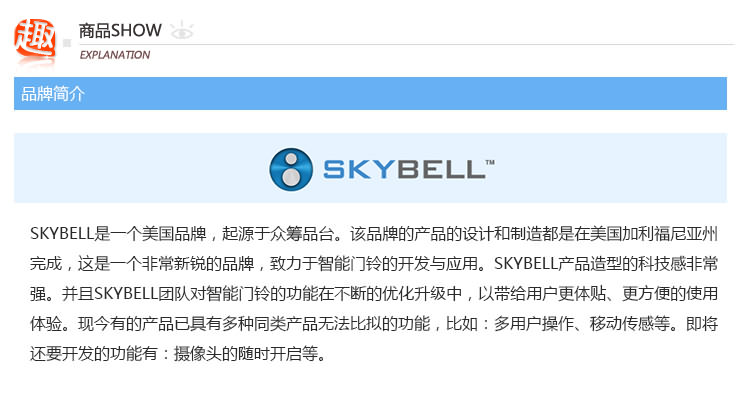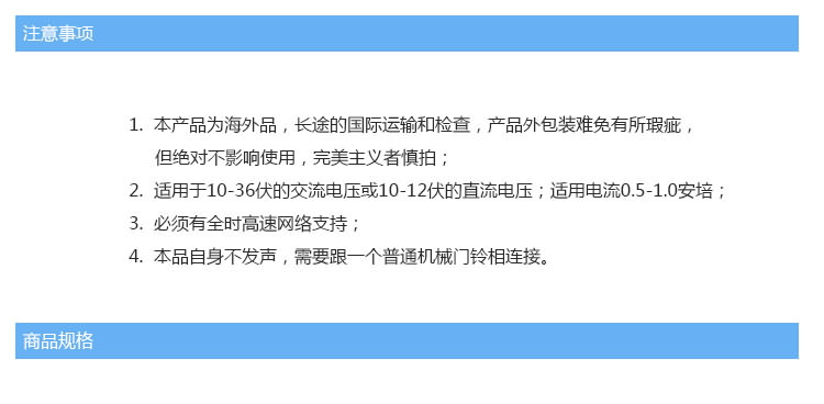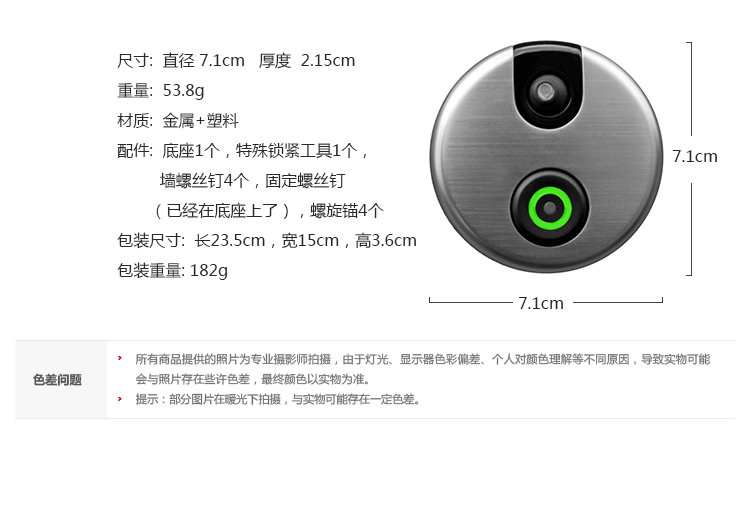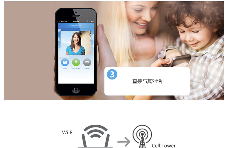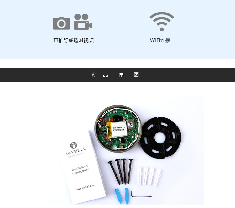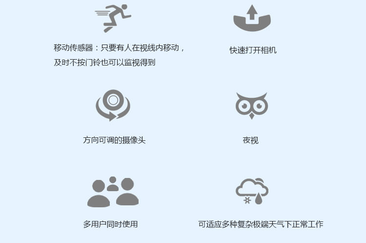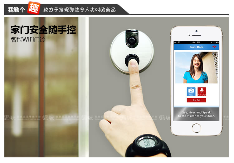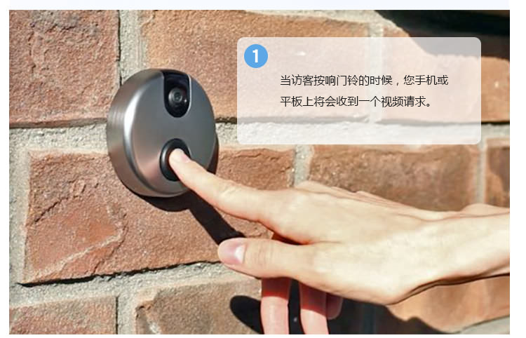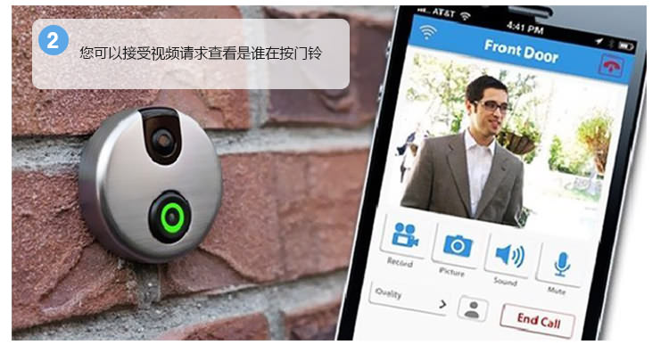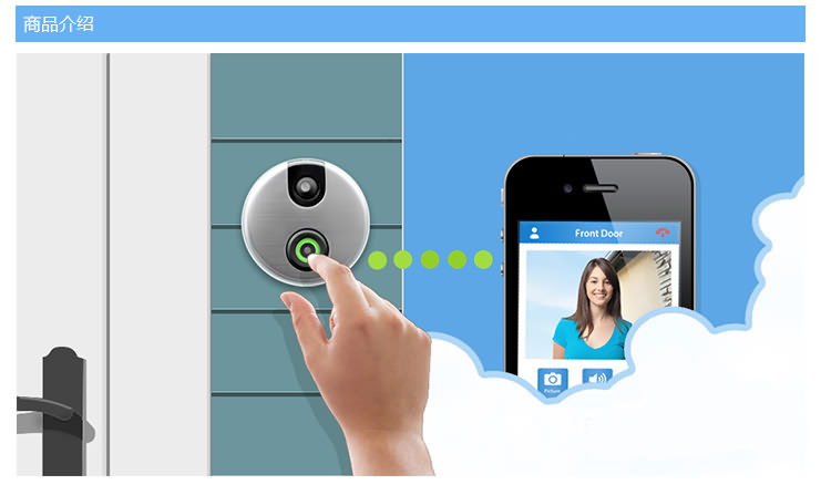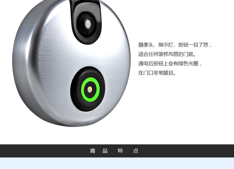 1.iDoorCam配备了红外摄像头、支持WiFi以及动态感应的门铃,能够把手机变身“猫眼”。 2. iDoorCam通过连接家中的WiFi,当有人按下门铃后,安装了iDoorCam应用的户主手机便会收到一条提醒,从而确认拜访者的身份,并与之视频对话,支持双声道。 。 3.门铃处于实时连接状态,手机无论是在WiFi环境或3G,4G,LTE下都可以收到提醒,因此户主可以随时随地地查看门外的人,因为有感应装置即使不按门铃也可进行截图和录像,支持170°视角,并有夜视功能。 4iDoorCam支持多用户,也就是说不同家庭成员可以同时收到门铃提醒。 5.仿铝的外壳能抵受水气、风雪和下雨等环境。