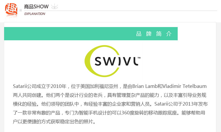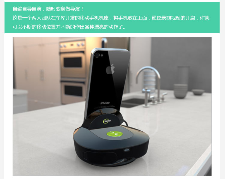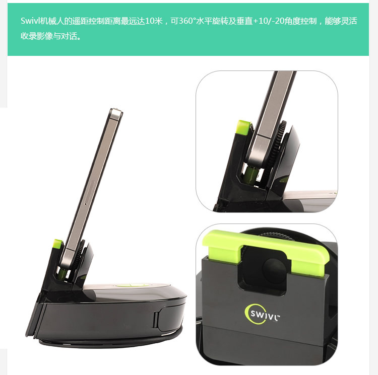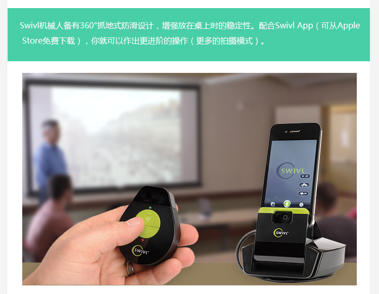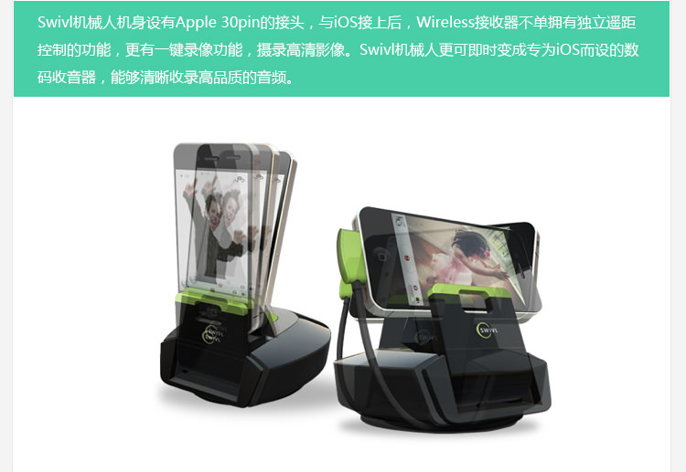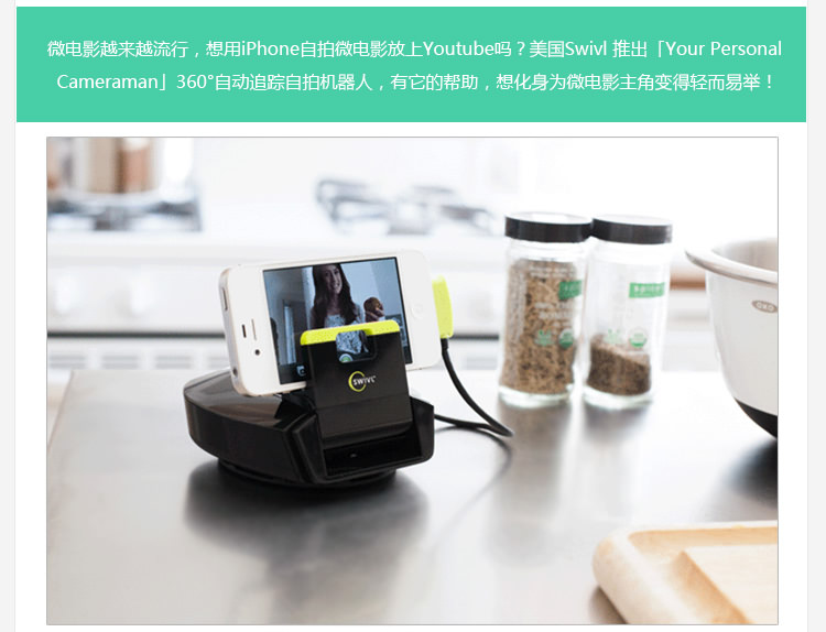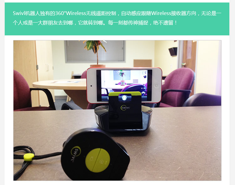 1.Swivl通过一组自拍底座和无线麦克让你轻松完成视频自拍过程。你只需把iPhone卡在底座上,同时底座会追踪你别在身上的无线麦克。这样,即使你在拍摄时随意走动,也不需要特地找人拿着设备了。 2.Swivl独有的360°Wireless无线遥距控制,自动感应跟随Wireless接收器方向 ,它既是一个动作传感器,还是一个保持录音清晰的话筒,并且还是一个精确控制Swivl的遥控器。 3.有效距离达到了10米,可360°水平旋转及垂直+10/-20角度控制 ,支架可以调节高度,能控制ios和安卓,还有一个适应大部分数码相机的底座。通过app还能有一些进阶的功能,用app遥控相机等。