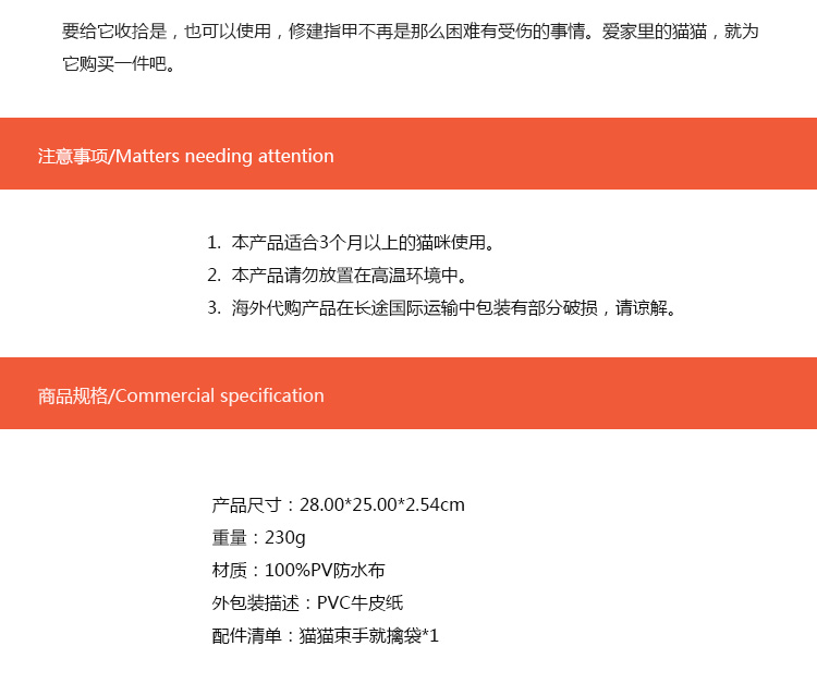 演示产品,请勿购买!! 演示产品,请勿购买!! 有了它,在顽皮的猫猫也乖乖听话。商品编号:41629重量:230g产品尺寸:28.00*25.00*2.54cm材质:100%pv防