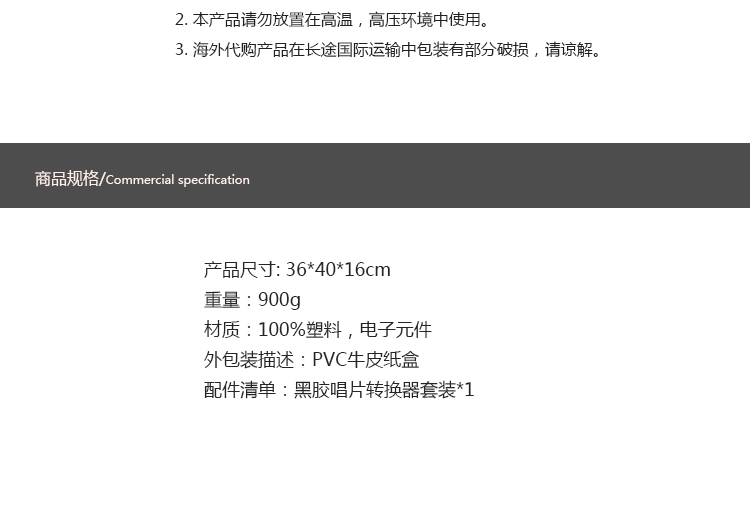演示产品,请勿购买!! 演示产品,请勿购买!! 可以将黑胶唱片转换为MP3格式的神器。商品编号:43133重量:900g产品尺寸:36*40*16cm材质:100%塑料,电1