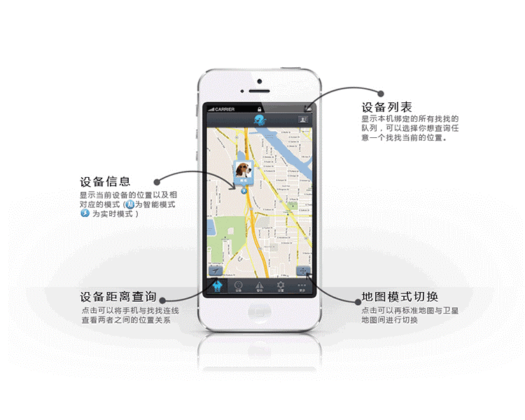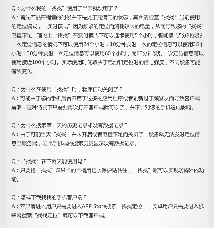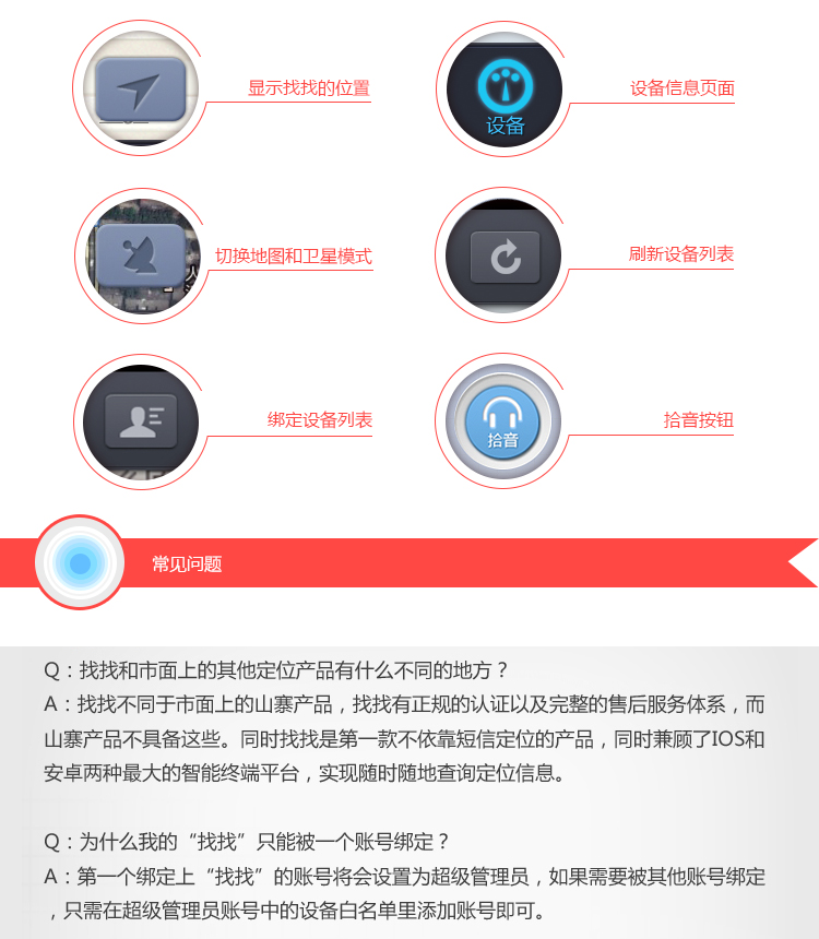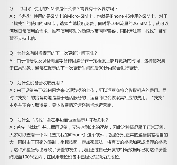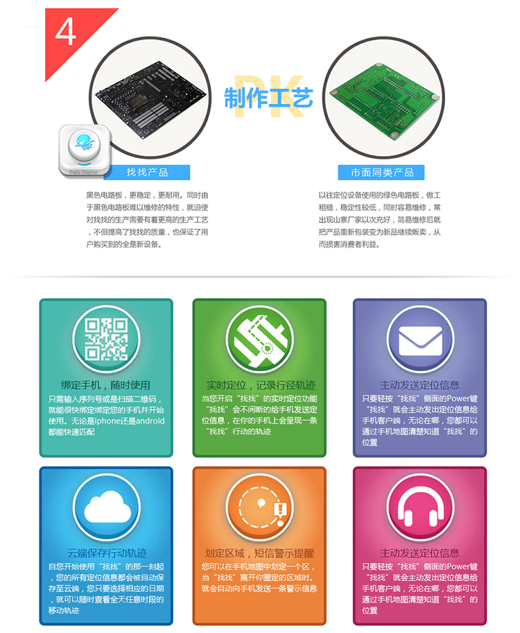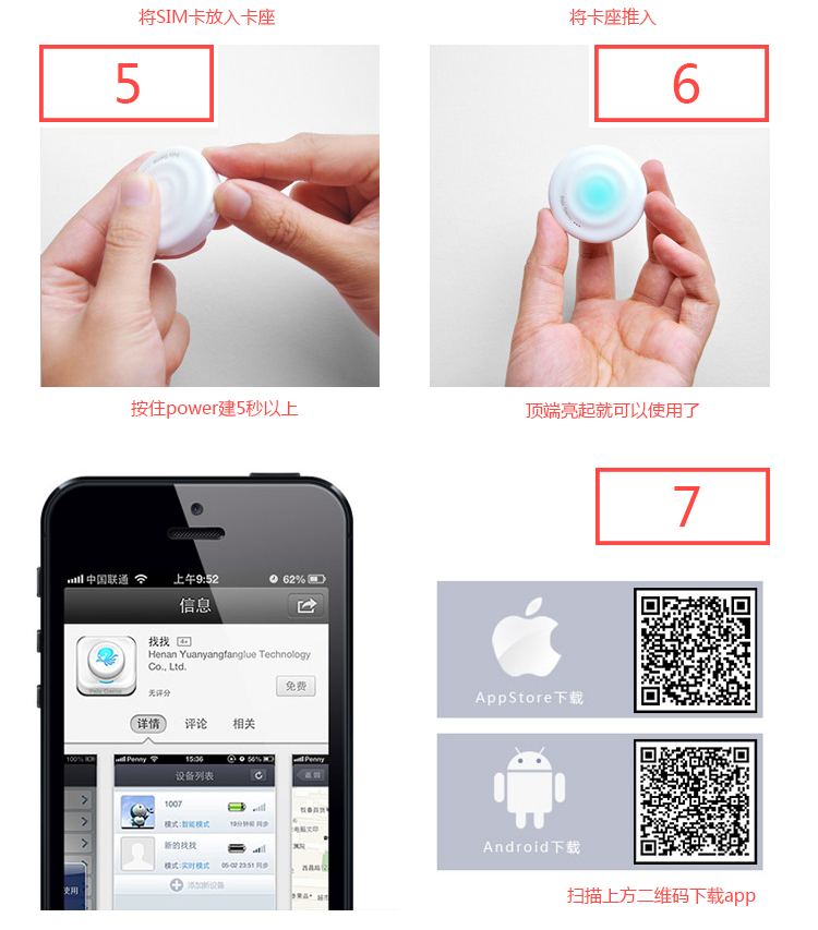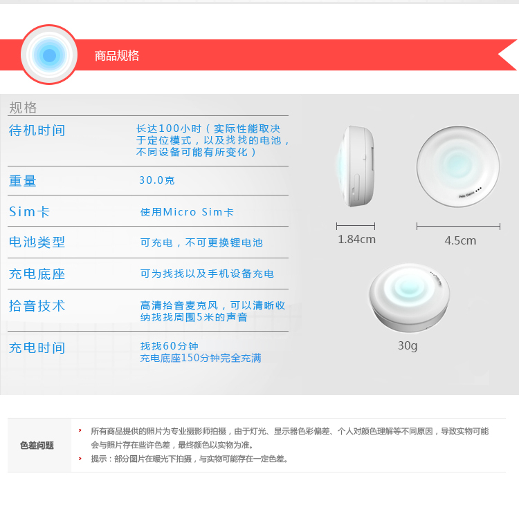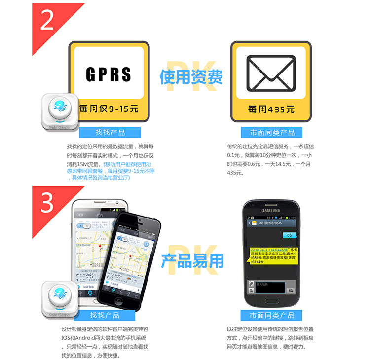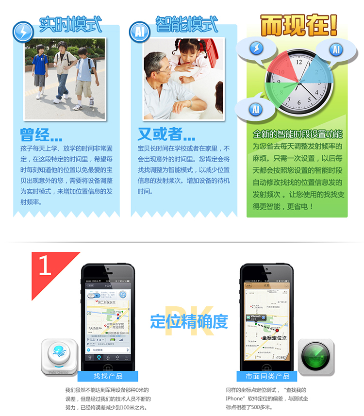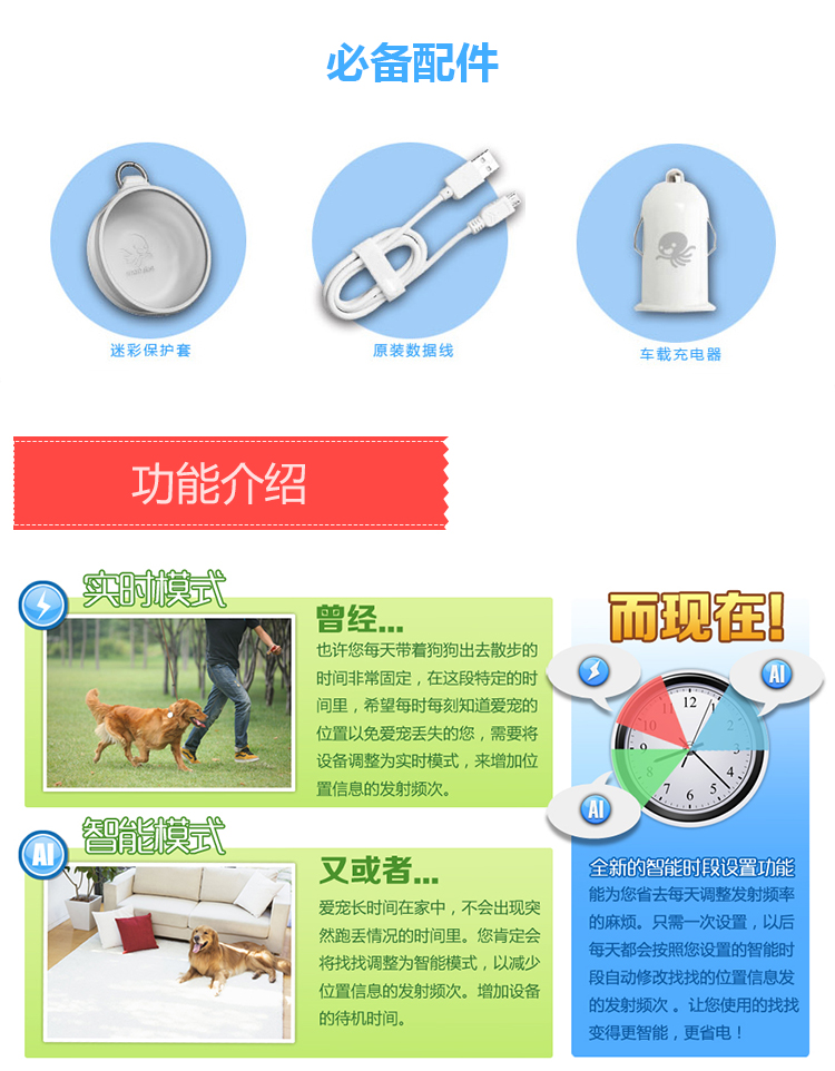 1,通过插入sim卡,使用GPS定位 2,任何地点,任何时间都能定位。 3,能记录下走过地方的路线,永久保存,随时都能看到历史记录。 4,能在地图上设定安全区域,一旦定位器离开,就会像手机发出警报。 5,有各种配件,可以挂在钥匙上或者也可以挂在狗链上。 6,待机时间超长,充电底座还能当移动电源。
