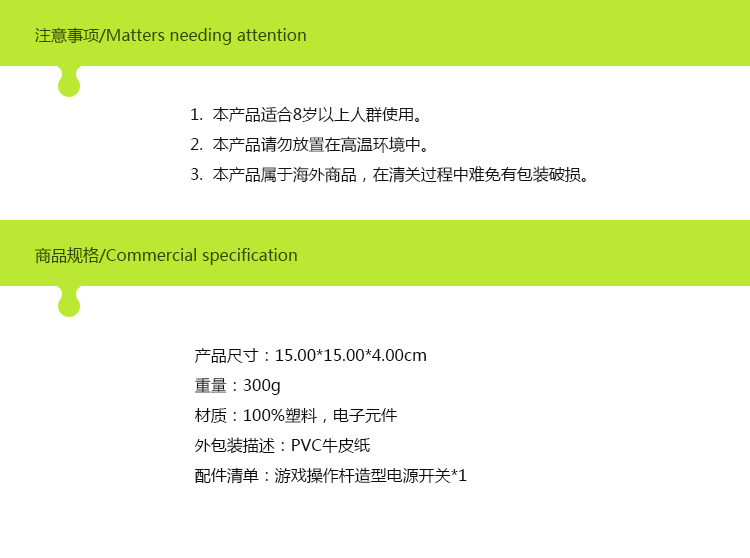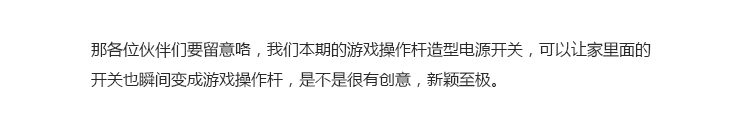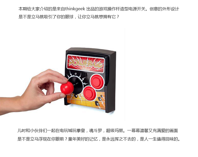 演示产品,请勿购买!! 演示产品,请勿购买!! 童年里的游戏操作杆,变身家里电源开关。商品编号:41411重量:300g产品尺寸:15.00*15.00*4.00cm材质:100
