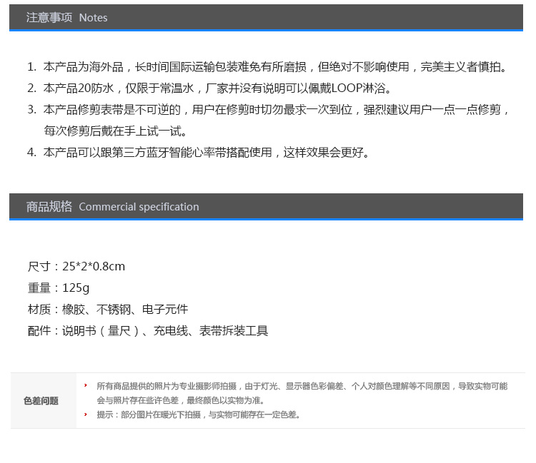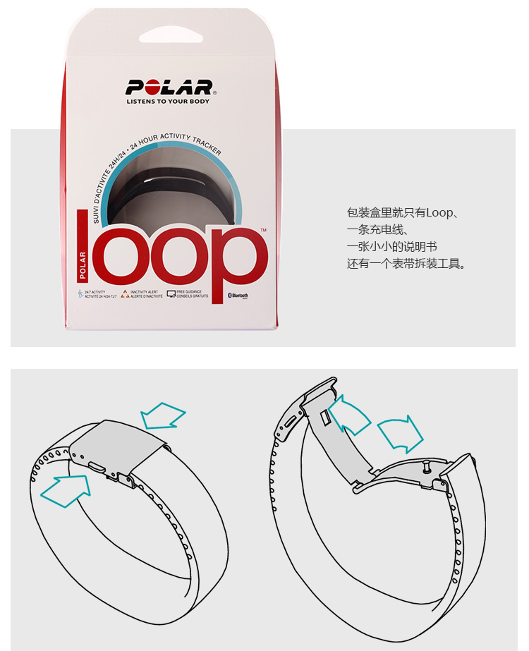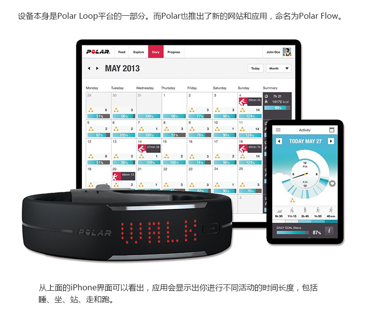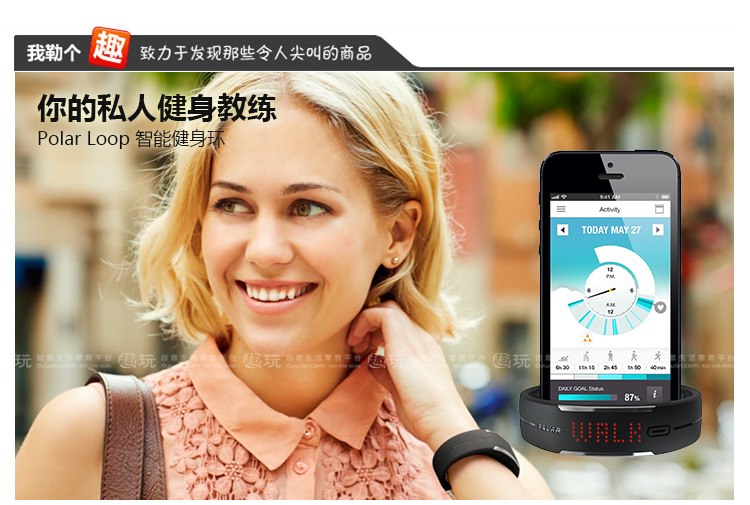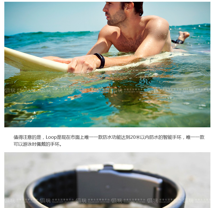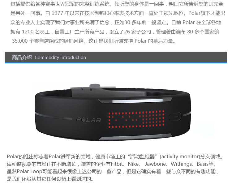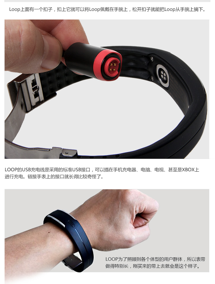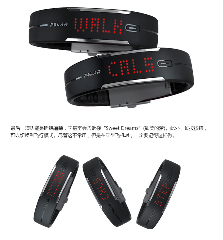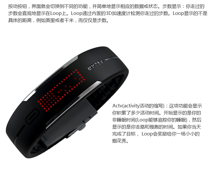 1.支持与智能设备低耗能蓝牙链接。 2.可识别5个运动等级,通过计算给出最佳的运动建议。 3.电力续航可达到5天。 4.提供用户iOS和Web界面进行运动量查看,云端后台储存数据。 5.外观具有防水设计。