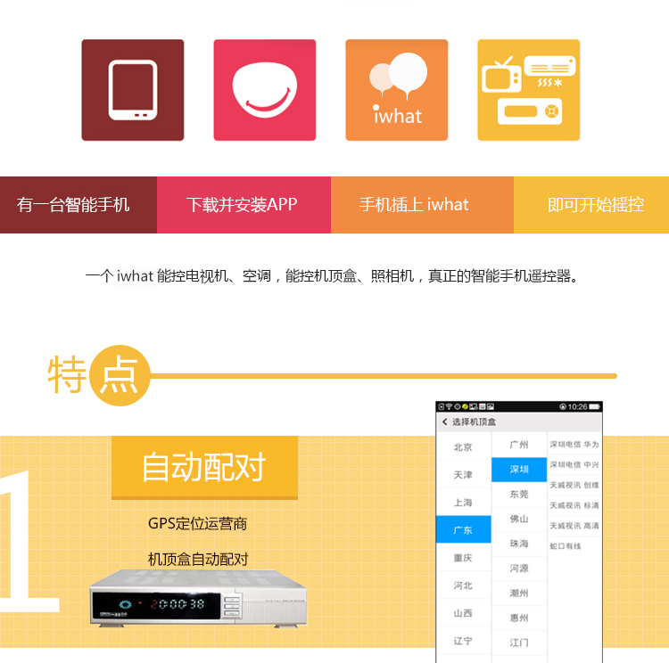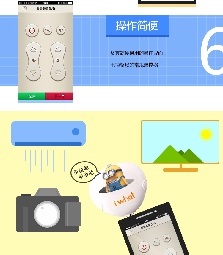 一台手机,双版兼容,下载软件,插入i 控,无需配对,即插即用,预制程序,轻松遥控,电视空调,单反相机,机顶。