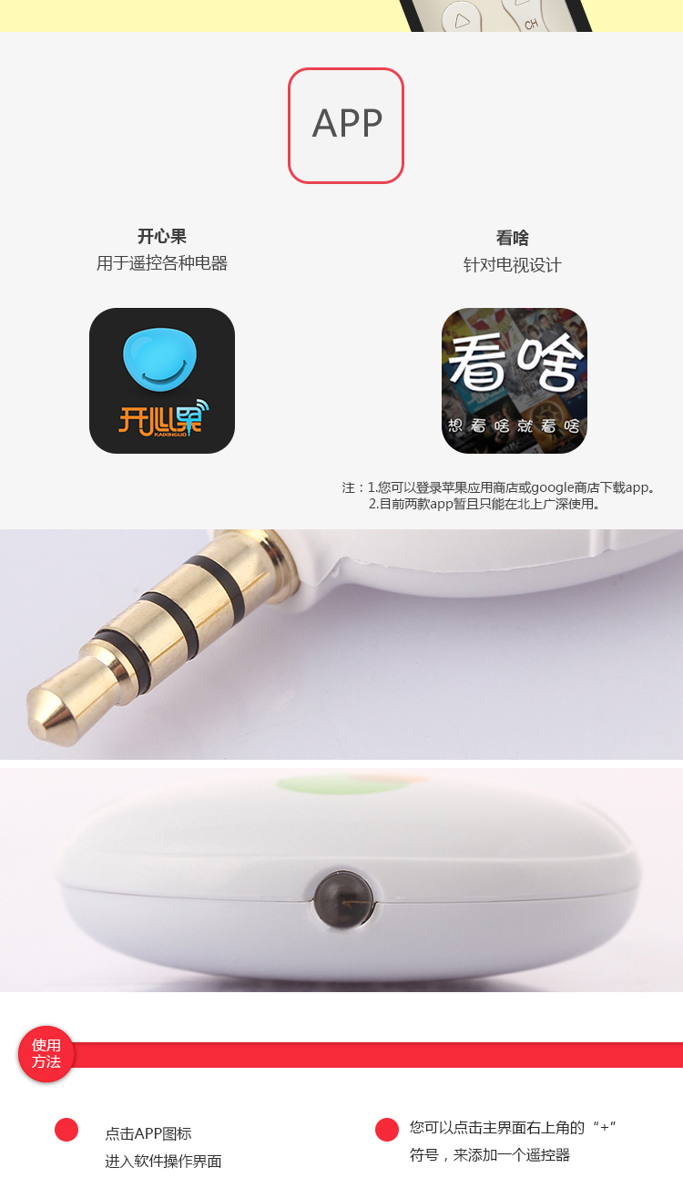 演示产品,请勿购买!! 演示产品,请勿购买!! 一台手机,双版兼容,下载软件,插入i 控,无需配对,即插即用,预制程序,轻松遥控,电视空调,单反相机,机4