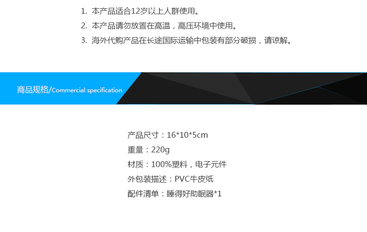 演示产品,请勿购买!! 演示产品,请勿购买!! 失眠,睡眠差的朋友们的福音。商品编号:42518重量:220g产品尺寸:16*10*5cm材质:100%塑料,电子元件商