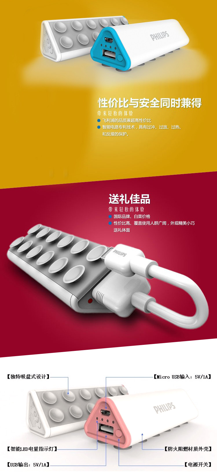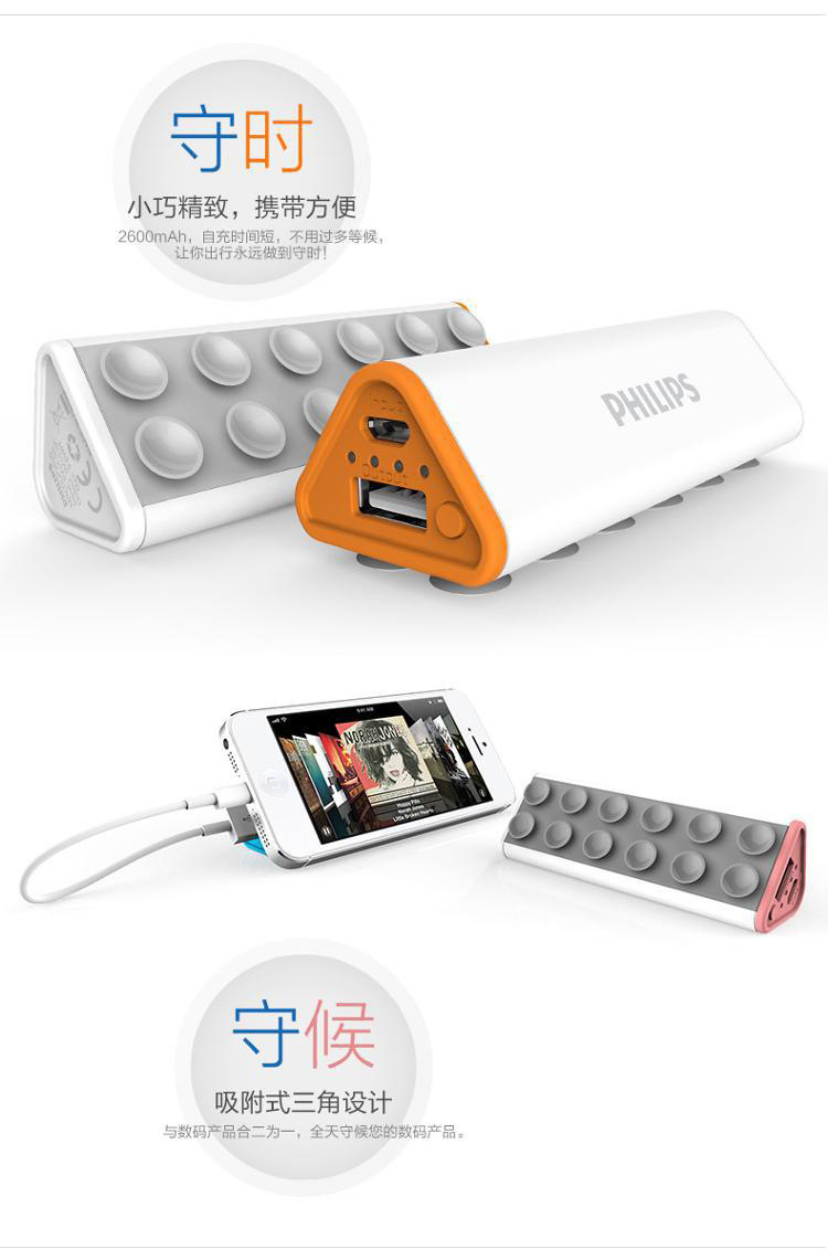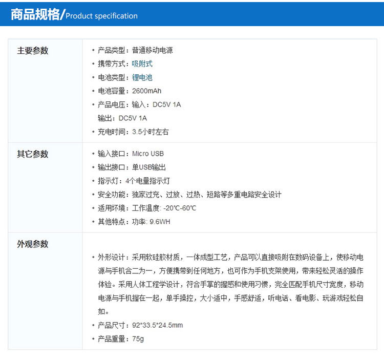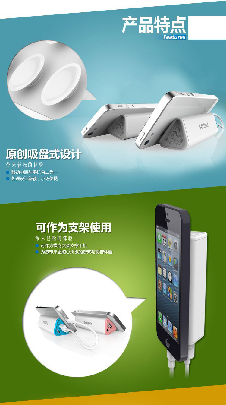 独特吸盘式设计,电源与手机合二为一,带来轻松灵活的操作体验.可作为手机支架使用.边充边用人性化设计.独家过充过放过热短路等多重电路安全设计。