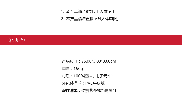 演示产品,请勿购买!! 演示产品,请勿购买!! 紫外线技术,帮你除掉99.99%的细菌,从根本保护您的家人。商品编号:41209重量:150g产品尺寸:25.00*3.003