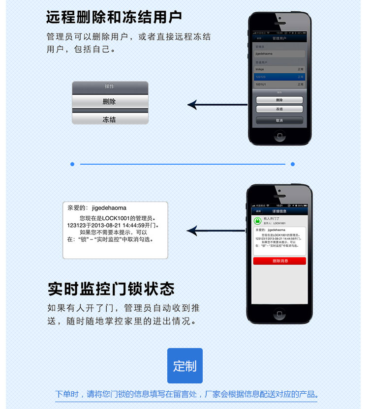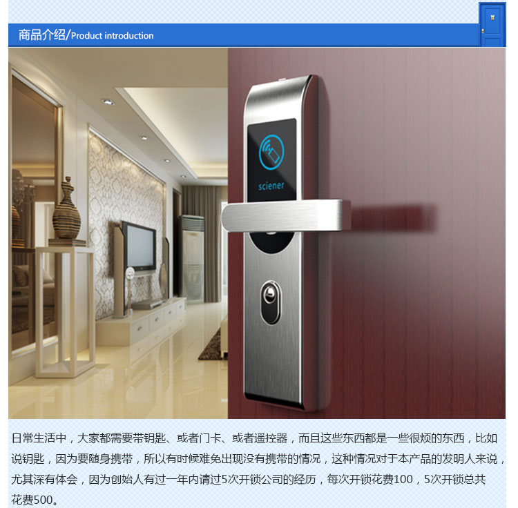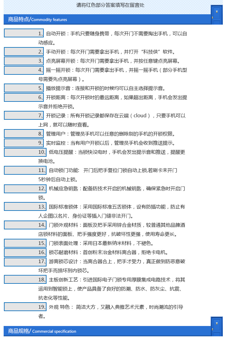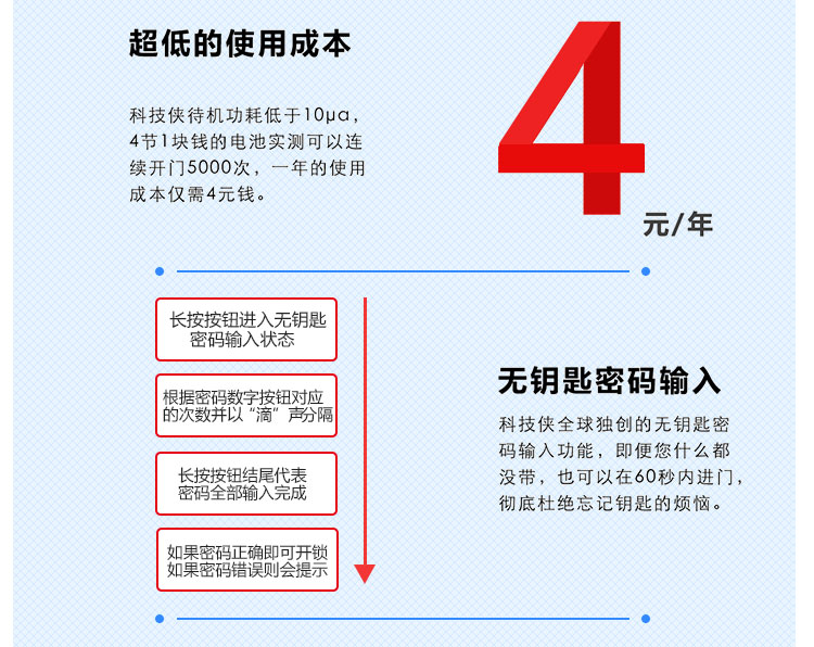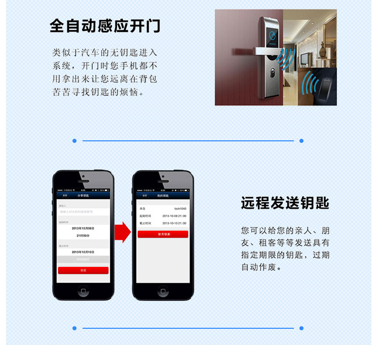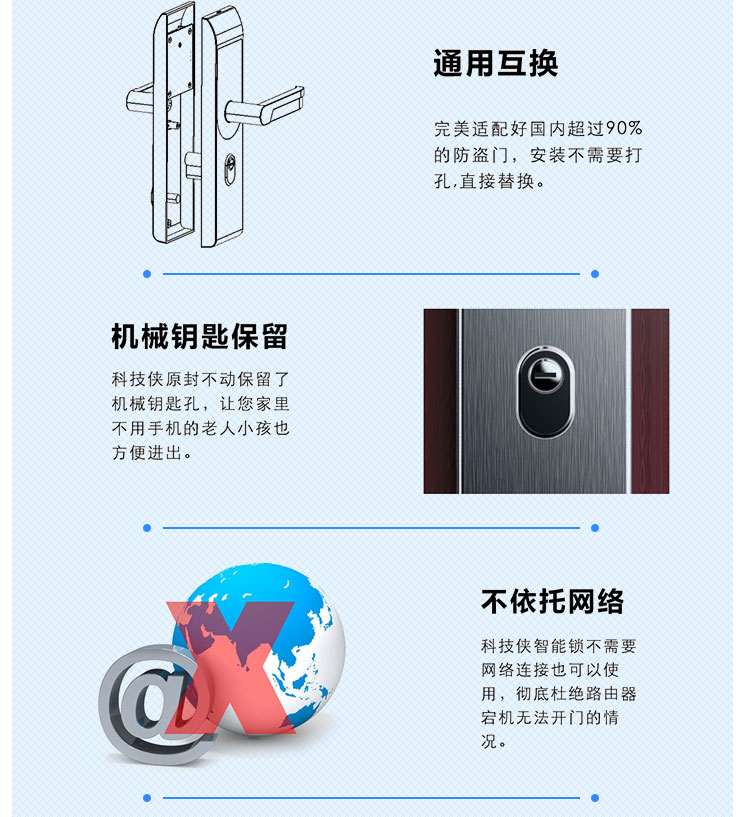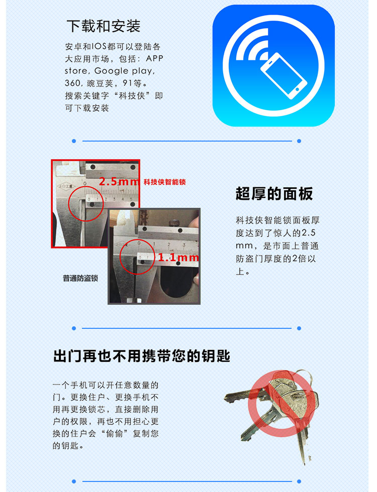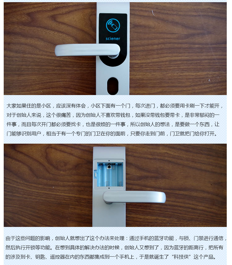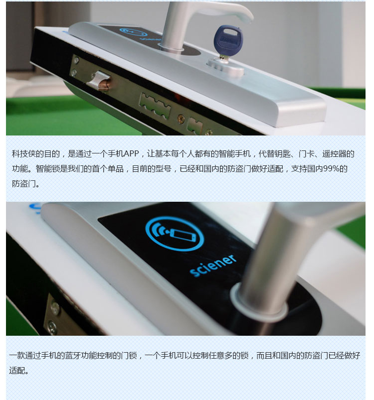 1.在手机上安装科技侠的 App,配上专用锁具,利用两者间的蓝牙通信,科技侠能让你丢掉钥匙,直接用手机打开家门。 2.设置开锁距离、查看开锁记录、开启消息推送功能,实时了解家门情况,增加安全性。