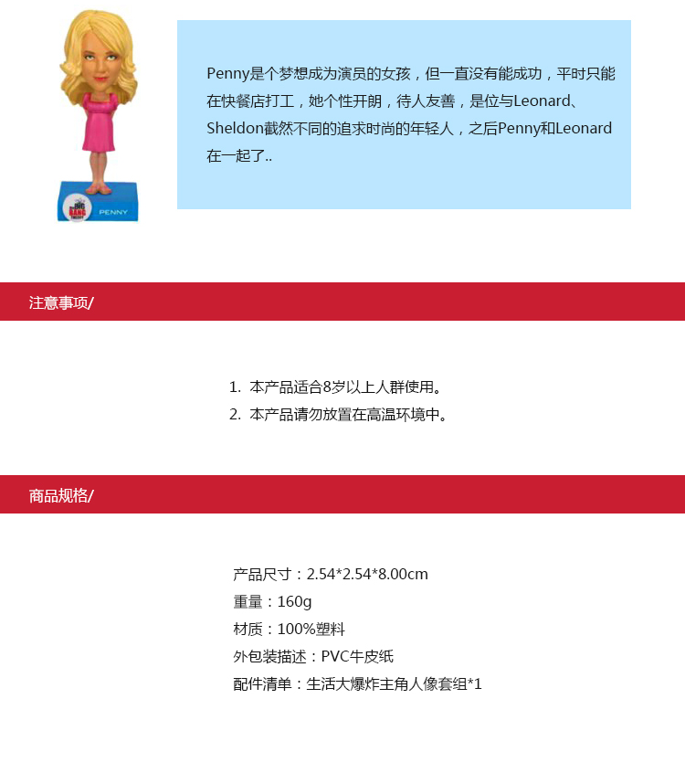 演示产品,请勿购买!! 演示产品,请勿购买!! 生活大爆炸,主角齐亮相,想拥有谁,就拥有谁?商品编号:41207重量:160g产品尺寸:2.54*2.54*8.00cm材质1