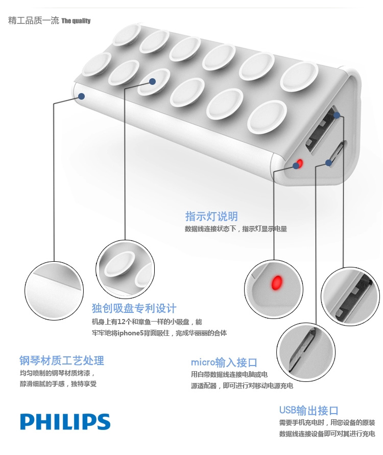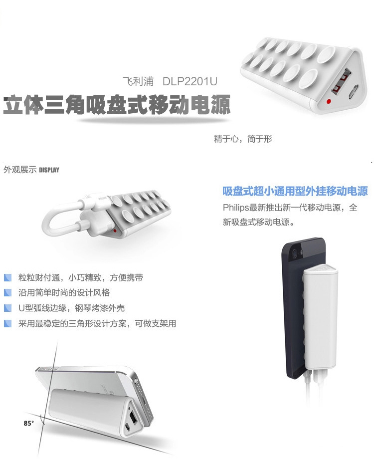 (相对于DLP2020) 通用型吸盘移动电源提供充足电量,使您尽情聊天浏览以及查阅产品轻小薄便于携带,随时随地均可使用采用吸盘设计。